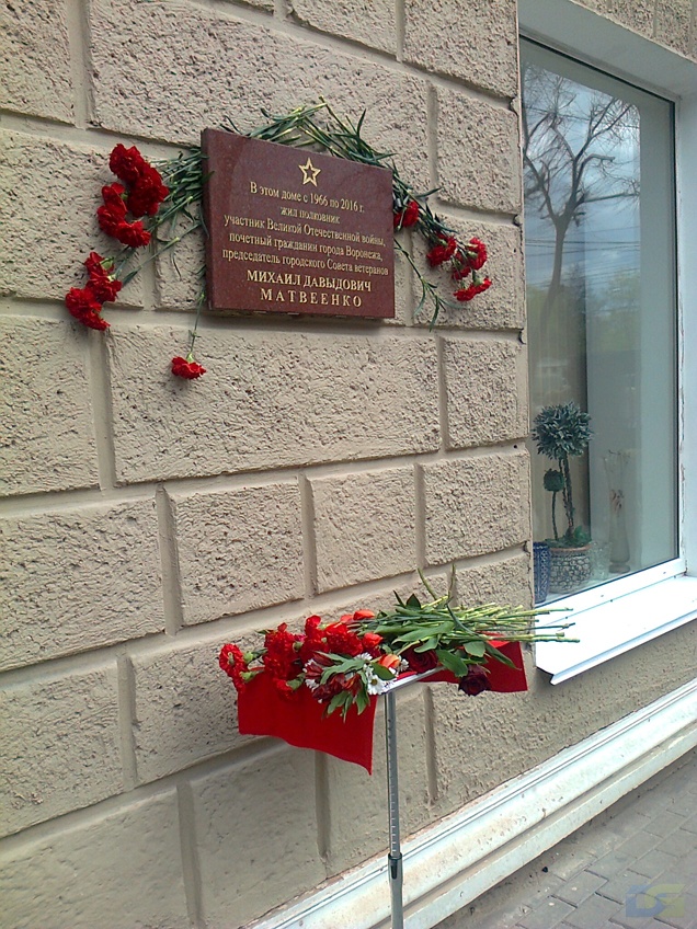 В Воронеже, на доме №3 по улице Мира торжественно открыли мемориальную доску гвардии полковнику, участнику Великой Отечественной войны, почётному гражданину города Воронежа Михаилу Давыдовичу Матвеенко, где председатель городского Совета ветеранов войны, труда, Вооружённых сил и правоохранительных органов в 1988-2008 гг., истинный патриот своей Родины и пламенный борец за мир жил с 1966 по 2016 годы.